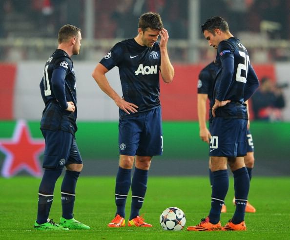 Wayne Rooney, Michael Carrick and Robin van Persie of Manchester United react as they restart the game after conceding the first goal against Olympiacos FC.