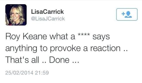 It would be interesting to see how Keane reacts to Lisa’s deleted tweet, or is it going to be Mrs. Keane taking the matters into her own hand now?