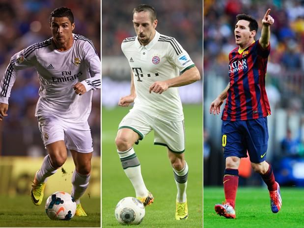 The 2013 FIFA Ballon DβOr finalists. (From left to right β Cristiano Ronaldo, Franck Ribery, Lionel Messi)