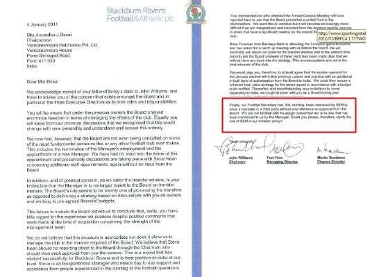 “Finally, our football secretary has, this morning, been instructed by SEM to issue a mandate to a third party without any reference or approval to the Board. We are not familiar with the player concerned nor is he one that has been mentioned to us by the Manager. Could you, therefore, please clarify the role of SEM in our transfer policy?"