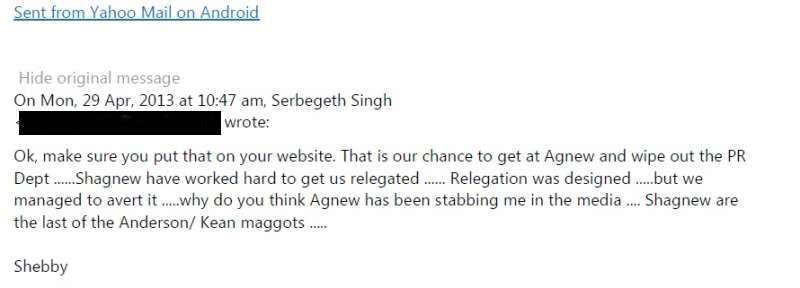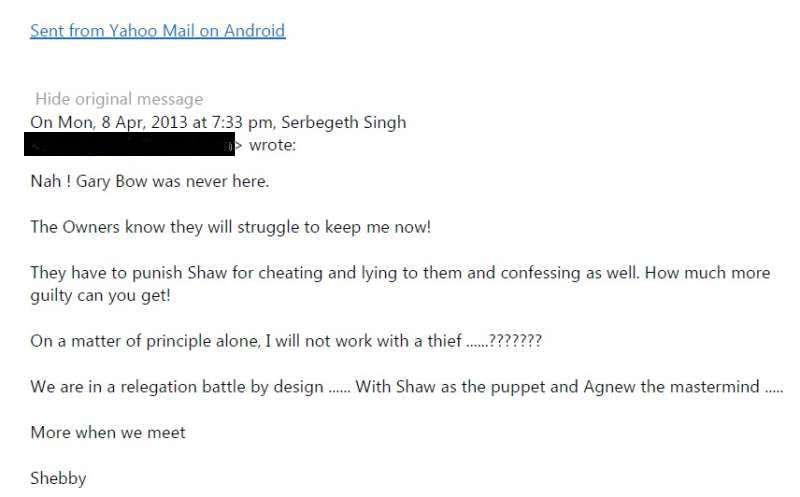 The former Malaysian footballer had, nevertheless, confirmed suspicion a month earlier about the misadventures of Paul Agnew and other senior figures of the club, in an email dated 16th March 2013.