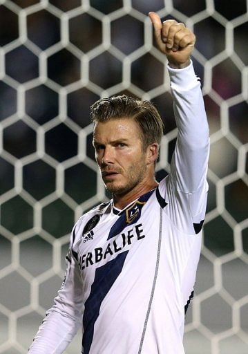David Beckham of the Los Angeles Galaxy gives a thumbs up to fans as he leaves the field after the match with the Seattle Sounders in Leg One of the Western Conference Championship at The Home Depot Center, on November 11, in Carson, California.
