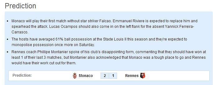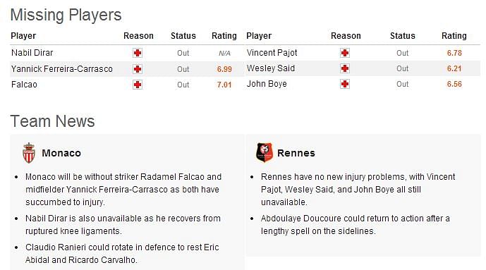 Monaco will play their first match without star striker Falcao. Emmanuel Riviere is expected to replace him and spearhead the attack. Lucas Ocampos should also come in on the left flank for the absent Yannick Ferreira-Carrasco.