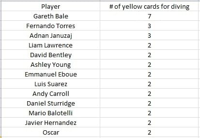 Mandatory yellow cards were introduced for simulation by the Premier League in 2008 and Gareth Bale leads that chart with 7 bookable offences. Fernando Torres and Adnan Januzaj both have been booked 3 times for play acting.