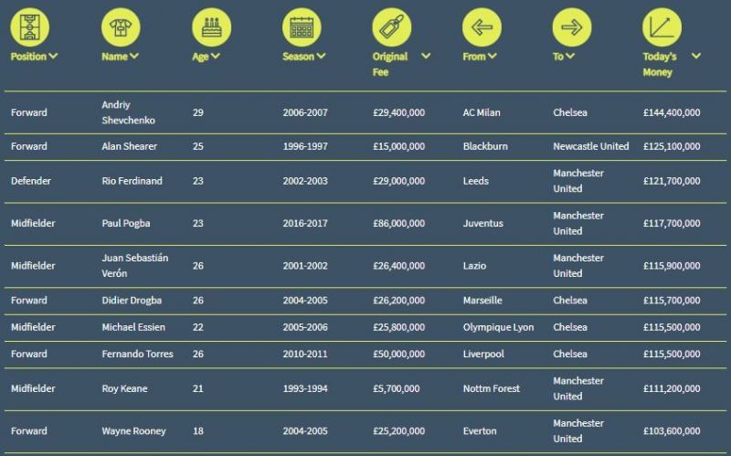 An interactive table gives the list of the transfer fees in today's money for all the transfers in the Premier League. Find out about the players from your club. Only Paul Pogba is in the Top 10 who still plays in the Premier League.