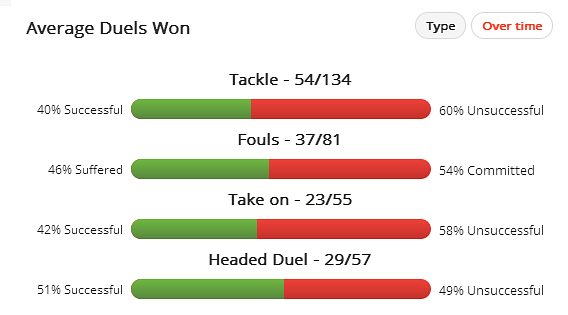 Terry averages nine Defensive Actions per game and wins on average three headers per game, showing his dominance for Chelsea at the back. In a game where Chelsea are going to defend deep, he’ll have lot to do to make sure that nothing gets past him. In Chelsea’s 0-0 draw at Arsenal Terry was a rock at the back, making nine clearances and winning four headers: