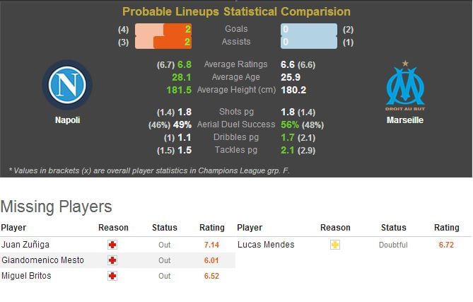 - Napoli are tied with Juventus in second place in Serie A, only three points off table-toppers Roma, who saw their progress slowed on Sunday. Morale is high since this match is against an under performing Marseille side and could give the Partenopei a leading position in Group F.