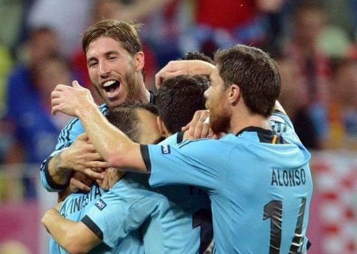 Spanish defender Sergio Ramos (L) reacts as he celebrates with teammates during the Euro 2012 football championships match Croatia vs Spain at the Gdansk Arena. Defending champions Spain are into the quarter-finals of Euro 2012 after replacement Jesus Navas hit the late winner in their nervy 1-0 victory over Croatia, who bowed out on Monday.