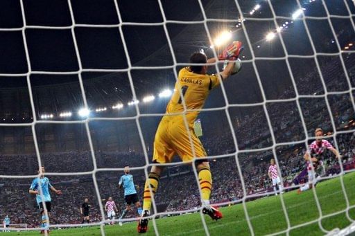 Spanish goalkeeper Iker Casillas makes a save during the Euro 2012 football championships match Croatia vs Spain at the Gdansk Arena. Defending champions Spain qualified for the Euro 2012 quarter-finals after replacement Jesus Navas hit the late winner in their nervy 1-0 victory over Croatia, who bowed out on Monday.
