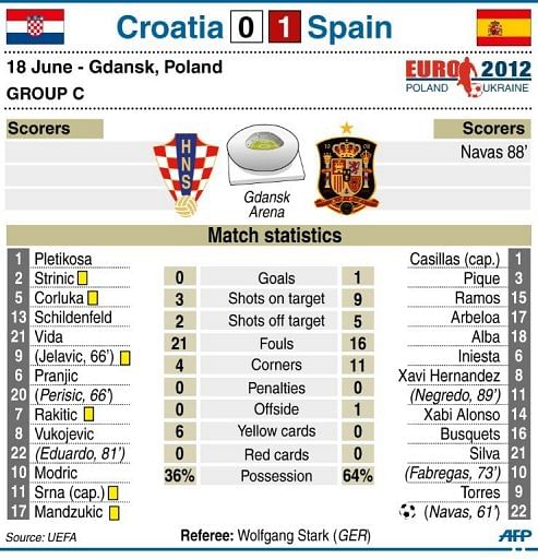 Defending champions Spain qualified for the Euro 2012 quarter-finals after replacement Jesus Navas hit the late winner in their nervy 1-0 victory over Croatia, who bowed out.