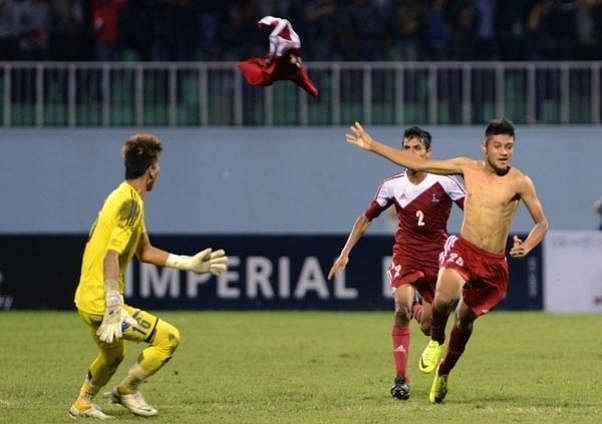 Bimal celebrating his goal against Pakistan in his debut for Nepal National team during SAFF Championship at Kathmandu
