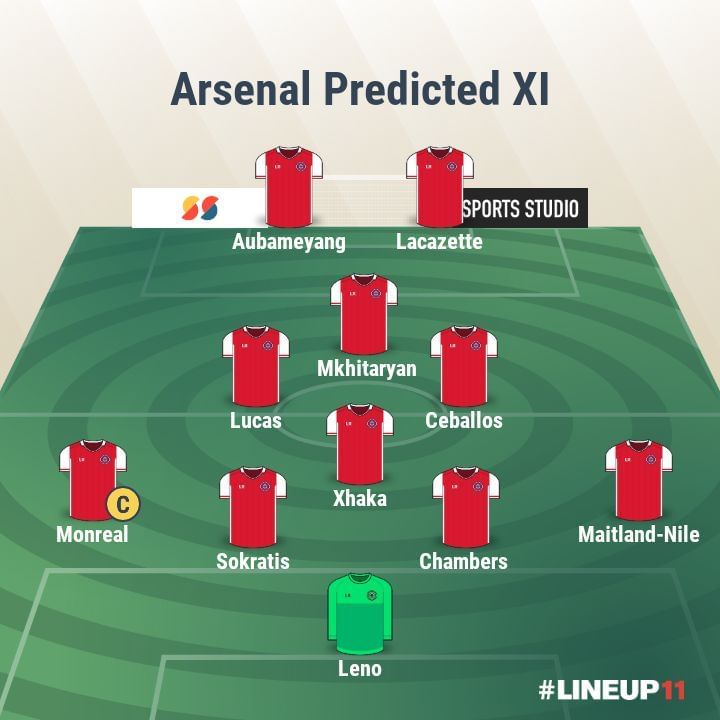 Arsenal (4-4-2 Diamond): Leno; Maitland-Niles, Chambers, Sokratis, Monreal (C); Xhaka, Torreira, Ceballos, Mkhitaryan; Aubameyang, Lacazette