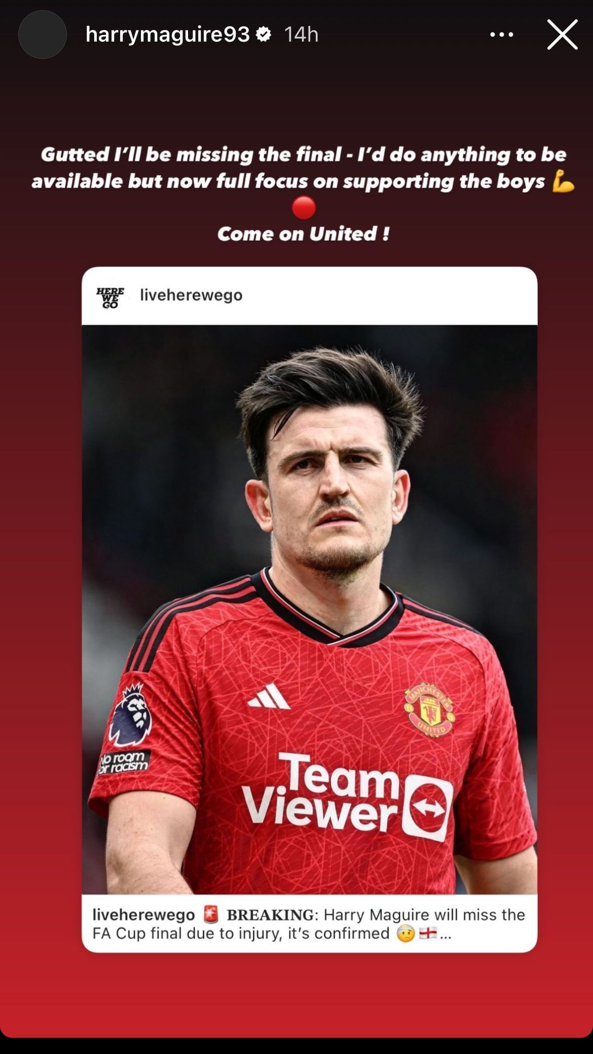 Manchester United defender Harry Maguire has confirmed on Instagram that he will miss Saturday's (May 25) FA Cup final against Manchester City.