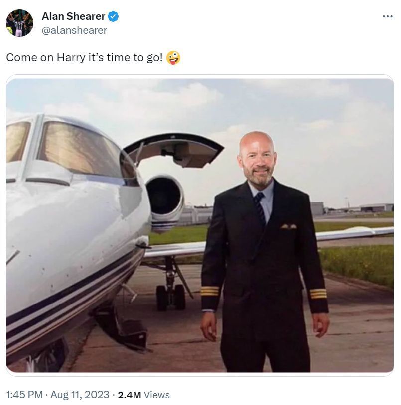 However, with the Englishman now seemingly off to Bayern, Shearer's record will be intact for a while. The Newcastle legend tweeted a picture of himself in front of a chartered aeroplane, playfully captioning it: