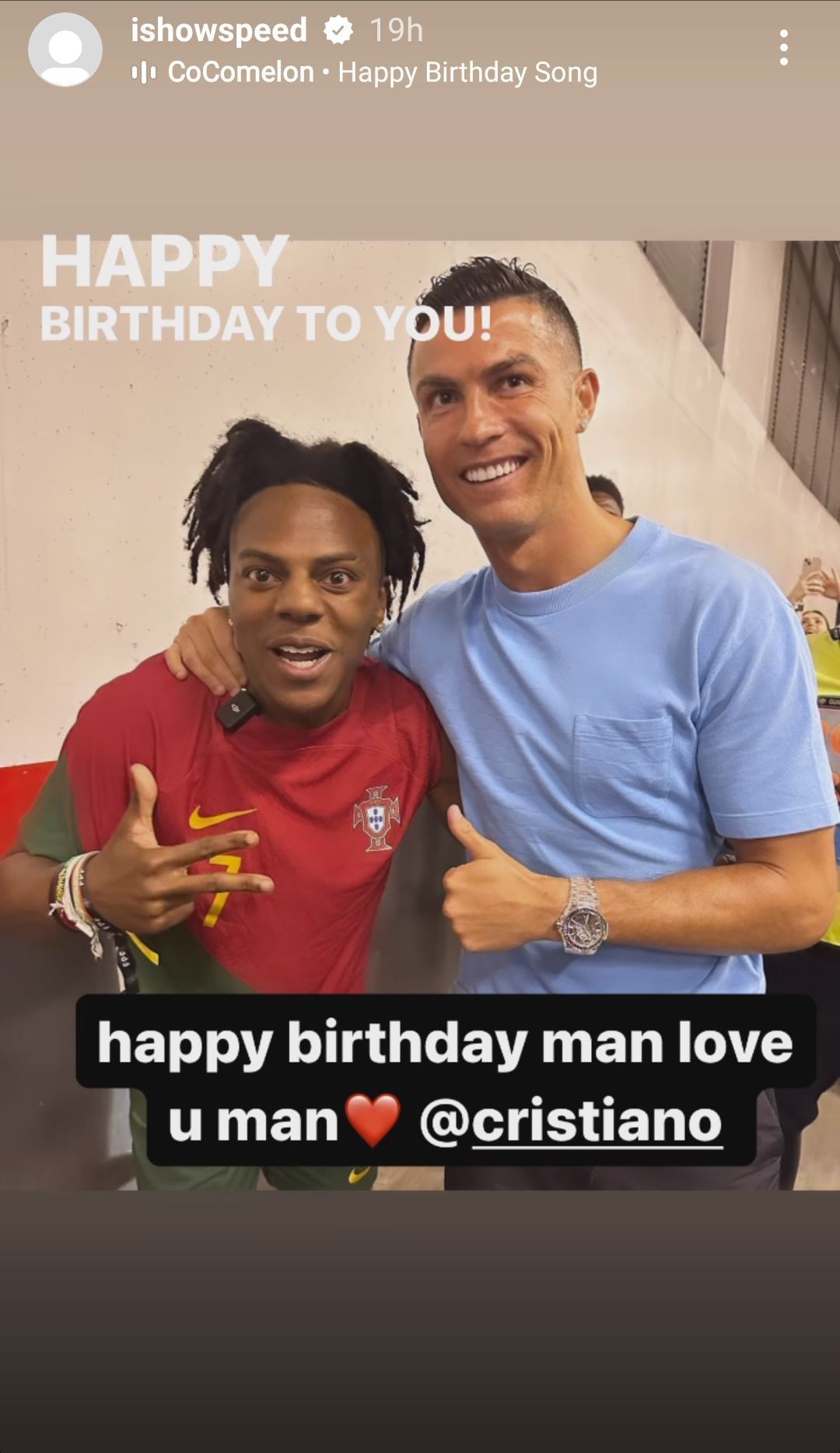 Popular YouTuber and mega Cristiano Ronaldo fan IShowSpeed wished the Portuguese icon his 39th birthday (February 5) via Instagram.