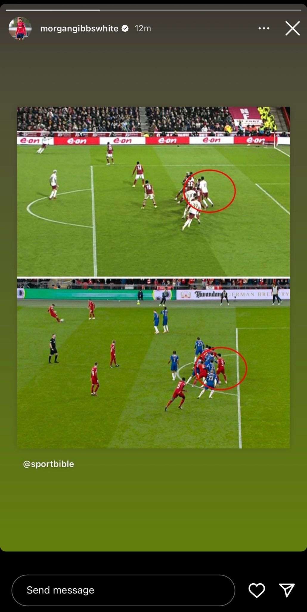 Gibbs-White took to Instagram and posted a story drawing a comparison between the non-offside call yesterday to the goal scored by Liverpool's Virgil van Dijk ruled out for offside in the EFL Cup final against Chelsea.