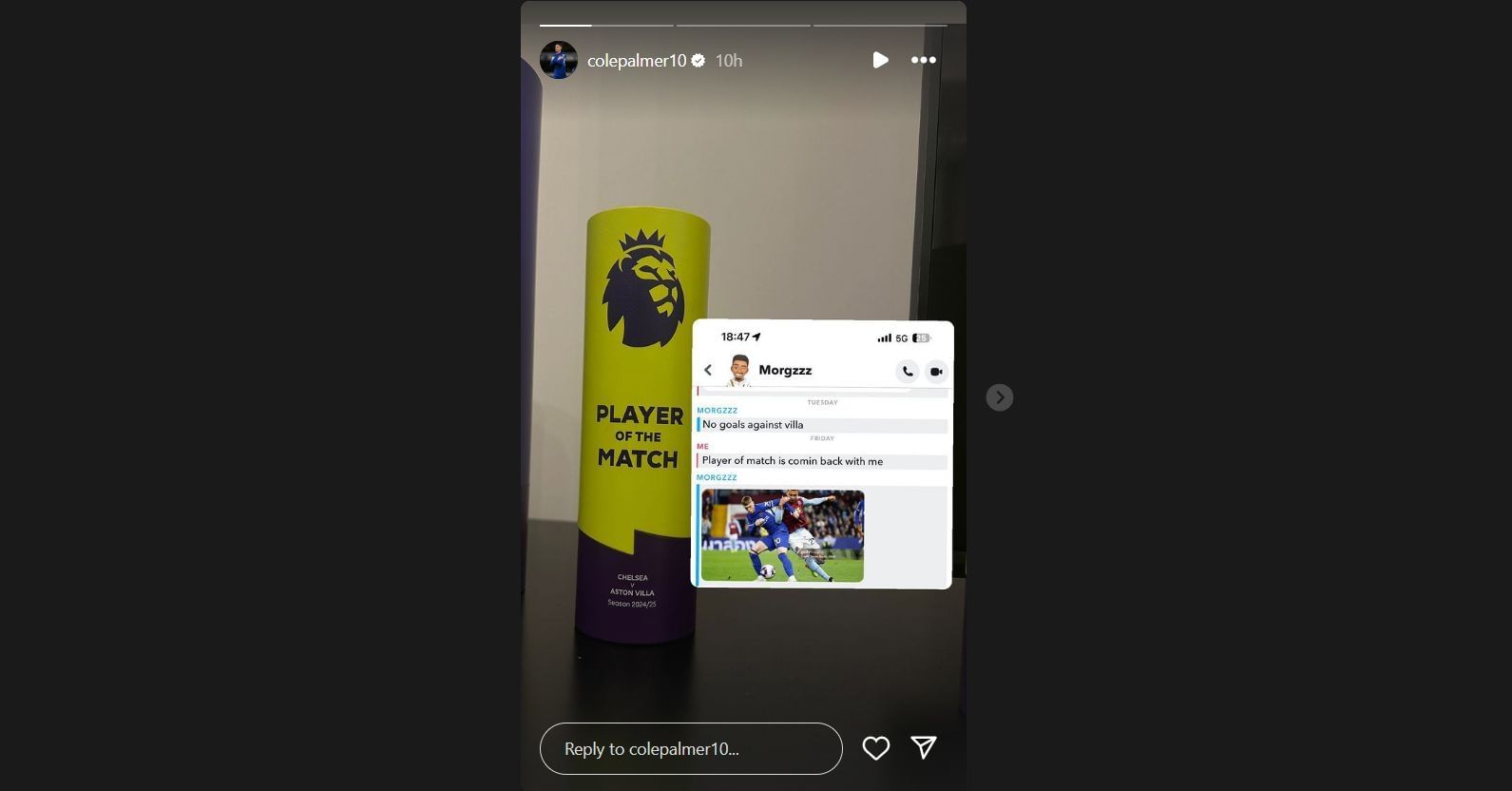 Cole Palmer rounded off the scoring seven minutes from time. Having also collected an assist, the Englishman walked away with the Man of the Match. Palmer later shared a screenshot of a private message from his good friend Rogers that he wouldn't score against Villa.