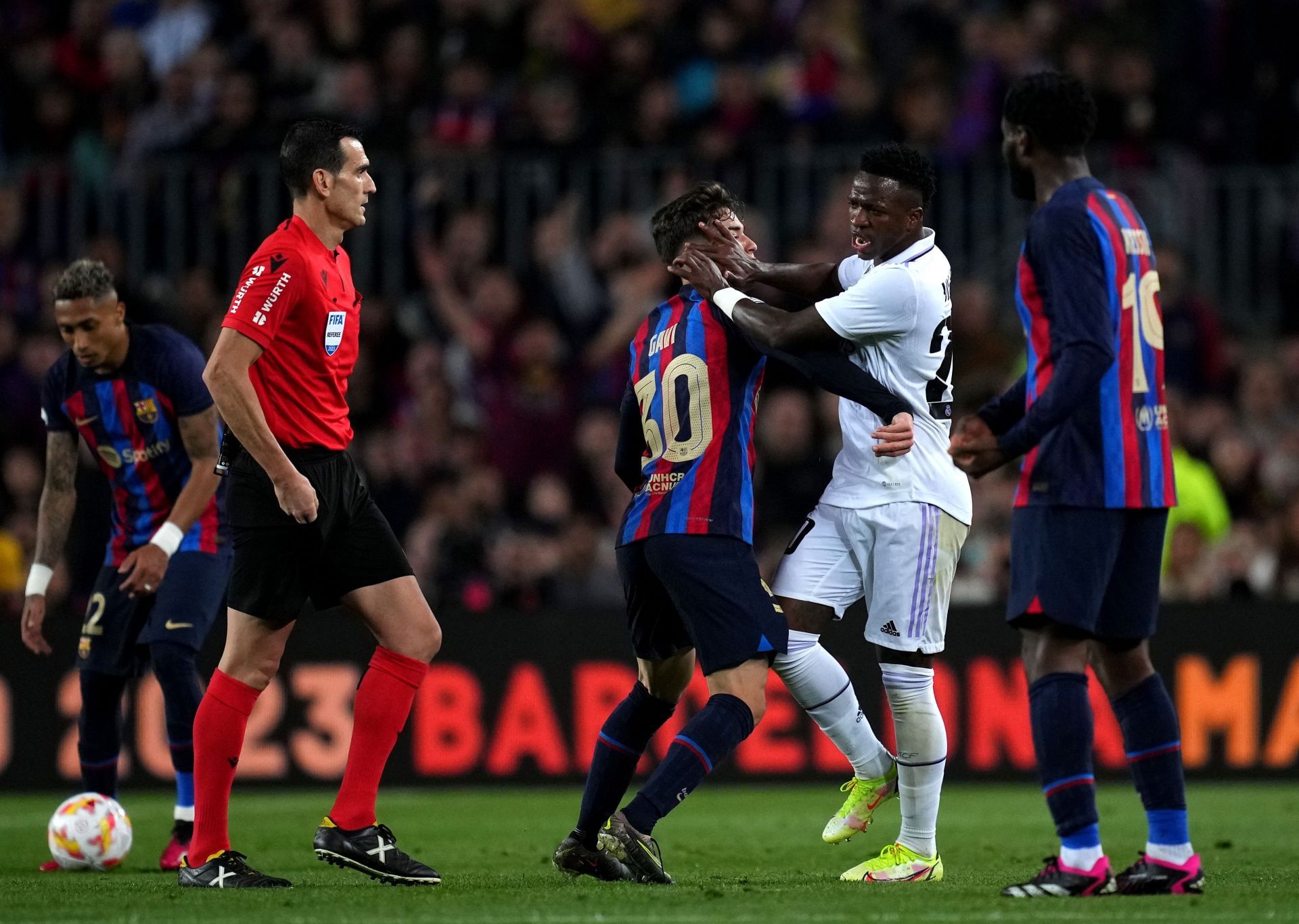 Vinicius was incensed by Barcelona players during the tense affair at Camp Nou and was already on a yellow card. His Real Madrid teammates were quick to calm him down to prevent the Brazilian from being given his marching orders. He clashed with Barca youngster Gavi in the first half, with both players receiving yellow cards for the ordeal.