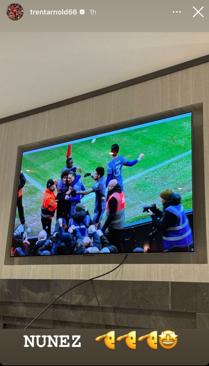 The Uruguayan forward scored in the 90+9th minute with the help of an assist from Alexis Mac Allister. After Nunez scored the goal, Liverpool's vice-captain Trent Alexander-Arnold took to Instagram and uploaded a picture of his television, where the Reds can be seen celebrating the winning goal.