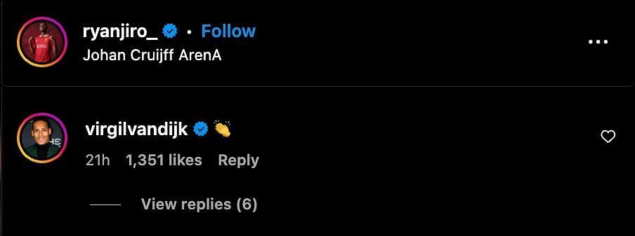 Virgil Van Dijk featured alongside Gravenberch in both games for the Netherlands this month and was impressed with his displays. The midfielder posted pictures from the international break on his Instagram, and his club captain commented a clap emoji under his post.