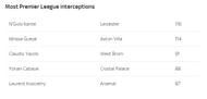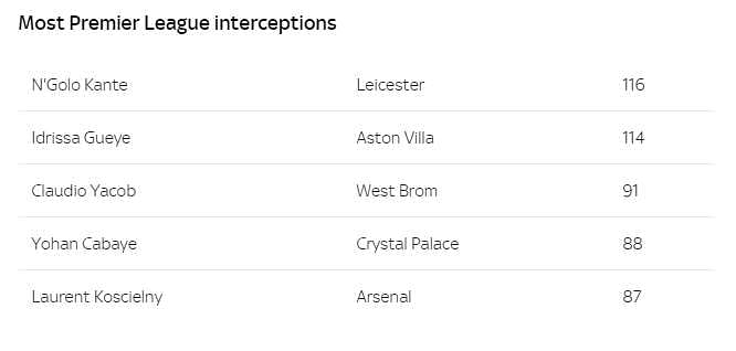 Both of them play as a battling duo giving the likes of Okazaki, Mahrez and Vardy license to play their brand of football. Kanté has made more tackles (119) and more interceptions (116) than any other Premier League player in the season so far.