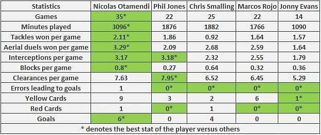 He averaged 2.11 tackles, 3.29 aerial duels and 0.80 blocks per game, all higher than the United quartet, while his average of 3.17 interceptions per game was only better by Phil Jones by 0.01 per game. Jones also averaged 0.32 more clearances than the 7.63 that Otamendi had last season.