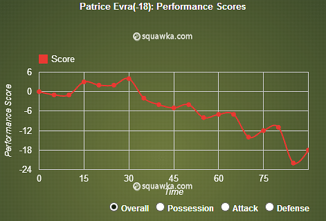As one would expect with a 32 year-old being run ragged, Evra’s performance graph decreased steadily- especially in defence as playing his third game in seven days it began to take its toll.