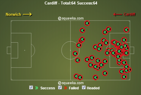 The ridiculous amount of clearances Cardiff had to make throughout the game further proves how dominant Norwich were on Saturday afternoon. 64 clearances in total had to be made by the Wales-based side, all of which were inside their own half. Although statistics show Norwich as the clearly better team from this game, Malky Mackay will be telling his players that they got as much out of the game as Norwich did and although Norwich dominated, Cardiff should be proud that they kept The Canaries out for 90 minutes and have came out of the match with their own (sort of) victory.