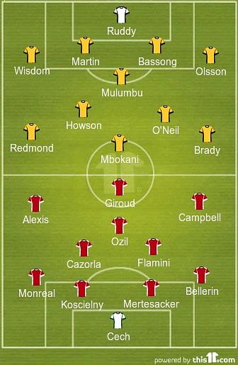 Norwich City (4-1-4-1): Ruddy; Wisdom, Martin, Bassong, Olsson; Mulumbu; Redmond, Howson, O’Neil, Brady; Mbokani.