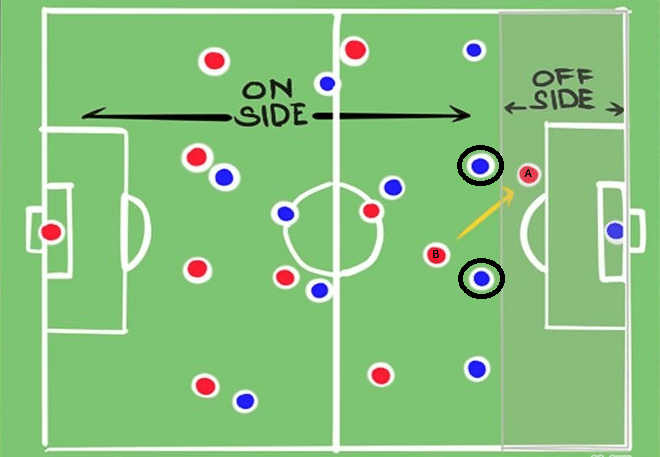 In the above illustration, ‘A’ would be called for an offside offence, if and when player ‘B’ plays a through ball to him, as he is behind the second-to-last opponent(s), that is, the two encircled defenders. In such a situation the linesman would raise the flag in his hand and the referee would stop the play and award an indirect freekick to the other team. In this situation, the team in blue.