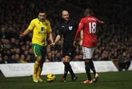 NORWICH, ENGLAND – NOVEMBER 17: Referee Anthony Taylor talks to Ashley Young of Manchester United and Robert Snodgrass of Norwich City during the Barclays Premier League match between Norwich City and Manchester United at Carrow Road on November 17, 2012 in Norwich, England.