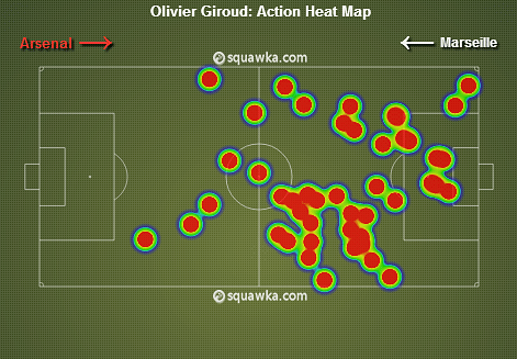 On a night when Jack Wilshere of all people netted a brace, Giroud couldn’t even register a clear shot on target. The closest he came was having a deflected effort trickle just wide of the near post. The other two efforts were blocked. He ended the game with the lowest Performance Score (-17 points) of any Arsenal player on the night, including the substitutes, but the fault is by no means all his own.