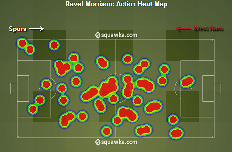 In West Ham’s best result of the season Morrison produced a stunning solo goal to help his side earn a fantastic 3-0 win at Tottenham. He works hard between boxes – as his heat map from White Hart Lane shows – but it’s these flashes of brilliance that can really cause damage.