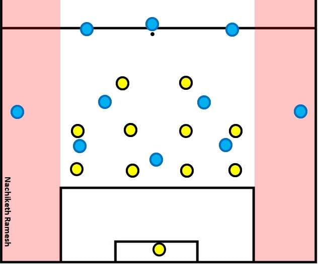 The positioning of players matters a lot when it comes to attacking and breaking down compact defences with low blocks. In all the previous methods of unlocking spaces in a low block, I have maintained one thing – positioning in the wings. But since it is easy to get pressed and force the ball backward, the wings offer much less positional superiority compared to the central regions.