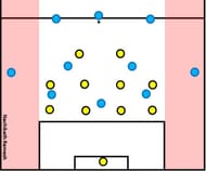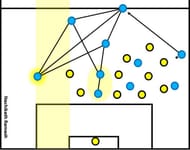 Another possible way of opening gaps in low defensive blocks is by concentrating the play on one particular region of the field – usually the wing or the half-space. This involves the attacking team focusing on combinational play in a narrow space and thus inviting the deep defending to press and win the ball. Since the defending team concentrates on blocking the ball progression through the space, it leaves open space on the far side.