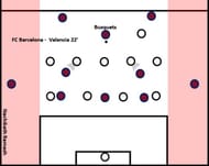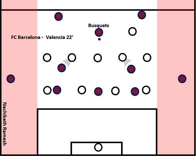 In the image attached below, we can see how the wingbacks of Barcelona positioned wide and deep. This gives the player on the ball, Sergio Busquets, the options of passing wide towards the right-back, Dani Alves. In the game, as a precaution, Valencia’s wide players on the left adjusted their body position so as to reach out to the player on the wing in case Busquets passed to him. But the Barcelona player actually passed the ball through the center to one of the central midfielders.