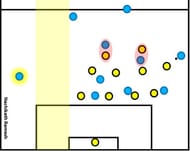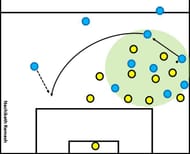 If the defending team is stretched and horizontal compactness is lost, then not just the space on the far side wings, but also space in the central region can be freed up. This can be accessed through a combination play triggered by a switch pass.