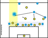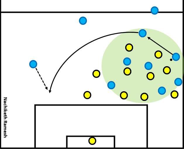 This space can be attacked by the free player through a switch ball or a direct diagonal ball. Overloading and focusing one side and finishing the attacking move through the other side has been one of the key aspects of Guardiola’s teams.