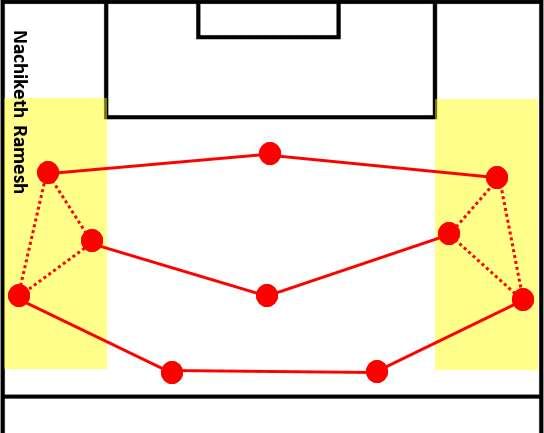 It could so happen that the defending team might not want to compromise with the horizontal compactness while moving the wide midfielder towards the ball. Such situations can leave open the half-space and wing on the far side. Accessing this half-space will be tough for the attacking team. However, the wing can be easily occupied, since it takes time for the team to shift, through a switch ball.