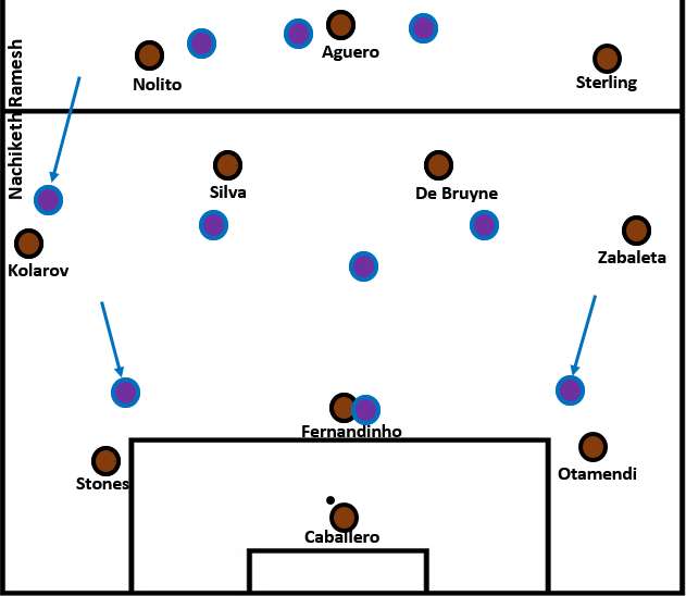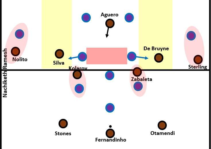 This should’ve been discussed earlier. But since the shape of the team was very much similar to that against Sunderland, I’ll only talk about a few specifics that were intriguing. First of all, the top half of the team was exactly the same – Aguero, Nolito, Silva, De Bruyne, and Sterling. Only the roles of Silva and De Bruyne were a bit different. Although they were #10s of the team, they had the freedom to move more towards the wing than in the game against Sunderland. This was mainly because to open the central region for attacks.