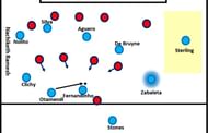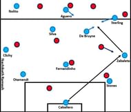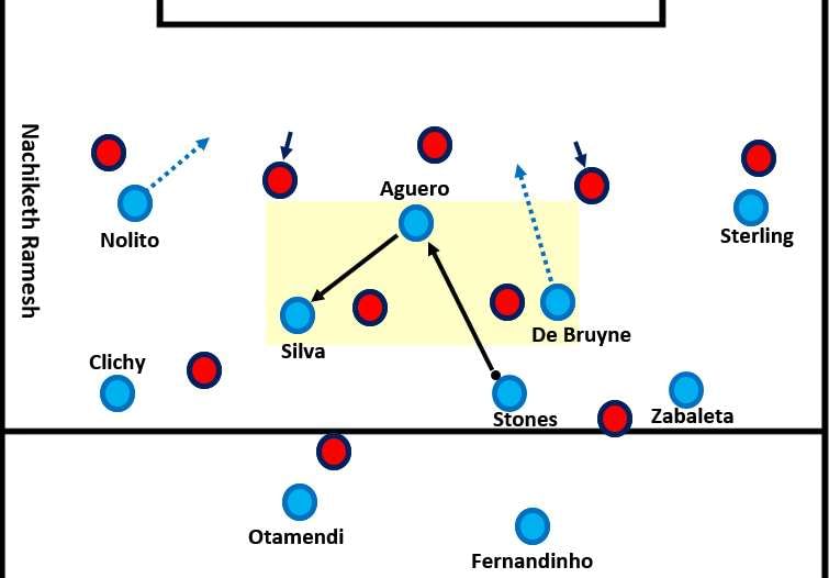In the above graphic, if one skips the positioning of rest of the City players, then justice is not being done. It is not just Zabaleta’s position, but it is also the position and the movements of the rest of the players that unlocked more space for Sterling. See that Silva, Aguero, and De Bruyne can all receive the pass.