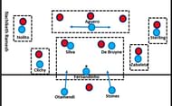 Silva and De Bruyne were alternating between the center and half-spaces, supporting the center backs in making forward passes towards them while maintaining a central position and allowing diagonal inward passes from the wingbacks while moving to the half-spaces.