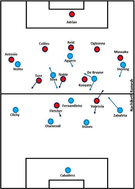 To combat a packed opposition in the midfield and the prospect of facing a three-man defense, Guardiola played his two playmakers – Silva and De Bruyne – a bit deeper than their usual position in the earlier matches. In the previous games, where City played a 4-1-4-1 and both these players played more like #10s, against West Ham they were deeper and narrower and seemed like #8s.