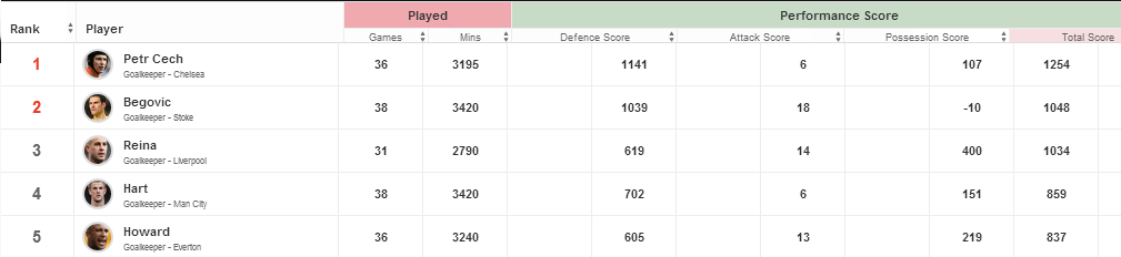 Cech was the best performing goalkeeper in the Premier League last season (Click on image to enlarge)