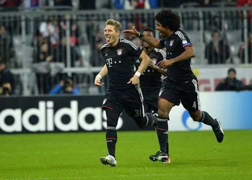 Bayern Munich’s midfielder Bastian Schweinsteiger (L) celebrates scoring with his teammate Brazilian defender Dante (R) during the UEFA Champions League Group F football match FC Bayern Munich vs Lille (LOSC) in Munich, southern Germany. Bayern won 6-1.