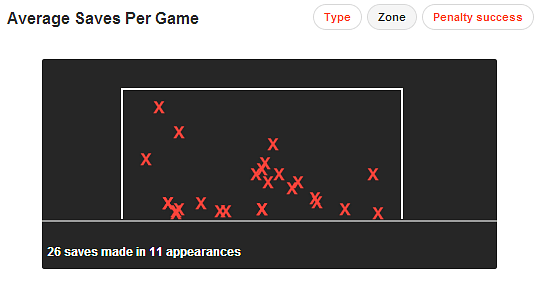 An average of 2.45 saves per game marks him out as one of the top shot stoppers in the division, but it is his ability with the ball at his feet which sets him aside from the majority. Of this particular quartet, Szczesny comes out on top with 67% and a 43m distribution length, illustrating his desire to play as short a pass as possible from his own box. It is a philosophy which is being replicated across the league, yet only Michel Vorm (75%) and Tim Howard (69%) can boast a better record in this department.