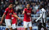 NEWCASTLE UPON TYNE, ENGLAND – OCTOBER 07: Man United player Rio Ferdinand (c) organises his defence during the Barclays Premier league game between Newcastle United and Manchester United at Sports Direct Arena on October 7, 2012 in Newcastle upon Tyne, England.