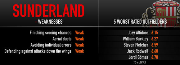 The Black Cats' underlying problem is as clear as day. Although they fell to an utterly humiliating 8-0 defeat to Southampton earlier in the season in the main Gus Poyet's side have been hard to beat. With just 18 goals scored, however, only Burnley and Villa have found the back of the net on fewer occasions despite the fact that six Sunderland players have scored more than once in the league.