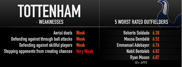 It seems ludicrous to suggest that Spurs should sign ANOTHER midfielder but ridding themselves of the deadwood building at White Hart Lane could free up space for more quality in that department. Given that Spurs are deemed 'very weak' at 'stopping opponents from creating chances' a higher quality of defensive protection is perhaps still a necessity.