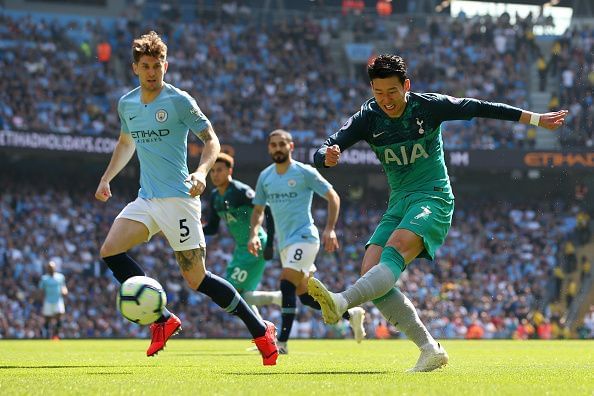 In the 44th minute, in the centre of the park, Son tricked Walker into committing, shifted the ball between his feet and zoomed past the field with Lucas Moura making a run on the left. Son fumbled at the edge of the box but the ball came off Raheem Sterling, setting Son up with an opportunity. However, Son was under pressure and couldn't place the ball past Ederson.
